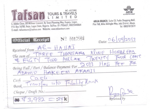 Hakeem comes from a very poor suburb in Lagos Nigeria. He lost his wife on the 1st day of Ramadan in 2013 due to illness. He couldn't afford the expenses for her medical bills and as a result her health deteriated until the point that he was left a widower. Hakeem was nominated for free Hajj by a relative that he has in the UK. We managed to secure enough funding to send him for Hajj in 2013. Unfortunately brother Hakeem was not able to send us any pictires from his Hajj trip but he was able to send us a thank you message (below). We've also posted pictures of his visa, airline tickets and the a receipt from the Hajj Opertaor in Nigeria who we paid for his package.
