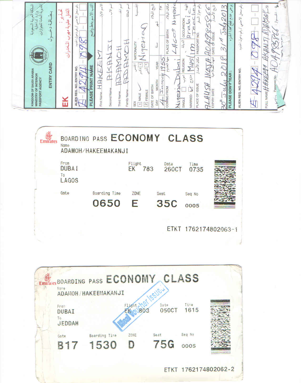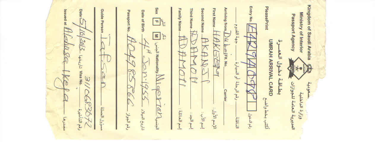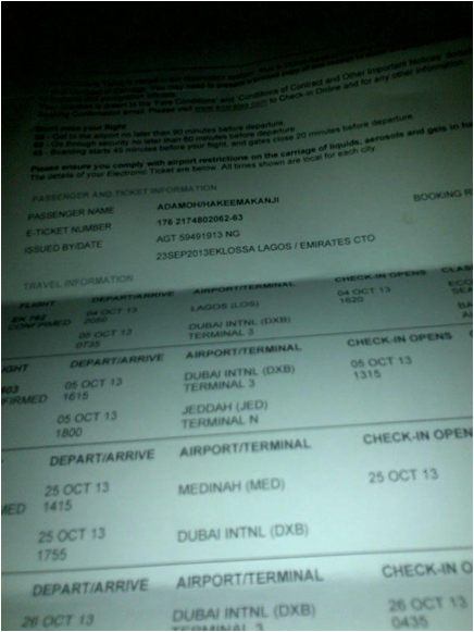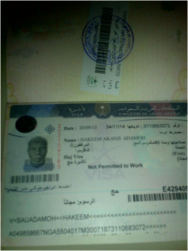 Hakeem comes from a very poor suburb in Lagos Nigeria. He lost his wife on the 1st day of Ramadan in 2013 due to illness. He couldn't afford the expenses for her medical bills and as a result her health deteriated until the point that he was left a widower. Hakeem was nominated for free Hajj by a relative that he has in the UK. We managed to secure enough funding to send him for Hajj in 2013. Unfortunately brother Hakeem was not able to send us any pictires from his Hajj trip but he was able to send us a thank you message (below). We've also posted pictures of his visa, airline tickets and the a receipt from the Hajj Opertaor in Nigeria who we paid for his package.